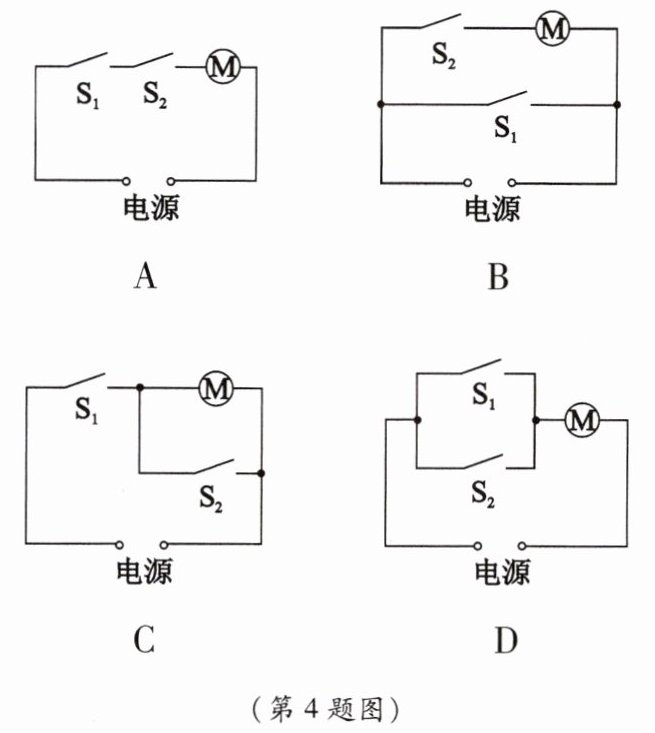 4. 小佳想制作一款智能头盔,只有戴上头盔且扣上卡扣后,头盔上的信号发射器才能发出信号,当电动车上的信号接收器(开关$S_1)$接收到信号,再转动电动车钥匙(开关$S_2),$电动车才能正常启动。下列电路中符合要求的是 (