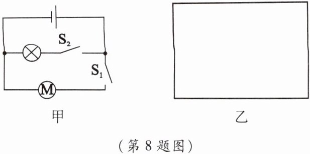 8. 小红有一款仿真电动玩具鱼,白天玩时,电动机工作,玩具鱼就会游动;晚上玩时,玩具鱼既会游动又会发光;不玩时,只需要将其中的某个开关断开,玩具鱼就既不游动也不发光。小红根据所学的电路知识画出玩具鱼的电路图如图甲所示。