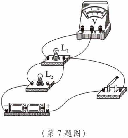 7. 在“探究并联电路的电压特点”的实验中,实物连接图如图所示,电源电压为3V。为使实验更加合理,灯$L_{1}$、$L_{2}$应该选择规格