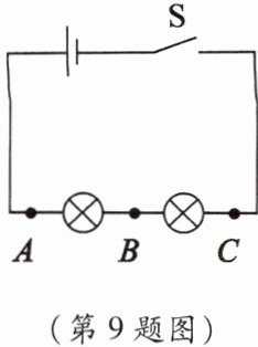 9. 如图所示,在探究串联电路的特点时,闭合开关,用电流表分别测出$A$、$B$、$C三处的电流I_{A}$、$I_{B}$、$I_{C}$,用电压表分别测出$A$、$B$,$B$、$C$,$A$、$C两点间的电压U_{AB}$、$U_{BC}$、$U_{AC}$。下列说法正确的是(