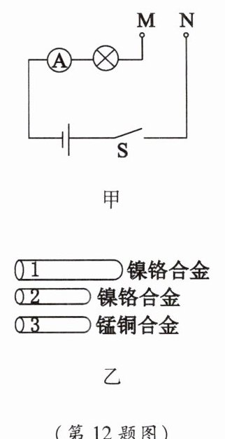 12. 同学们利用如图甲所示的电路探究影响电阻大小的因素,其中电阻丝1、2、3的材料规格如图乙所示,电阻丝2、3长度相同、粗细相同,电阻丝1长度最长、横截面积最大。下列说法正确的是(