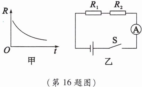 16. 在科技活动中,小军认识了一种热敏电阻,其电阻R随温度t变化的图像如图甲所示。请回答: