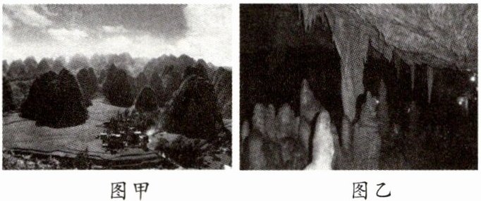 图甲所示地貌为峰林,是流水的化学溶蚀作用形成的;图乙所示地貌为石钟乳、石笋、石柱,是流水的沉积作用形成的。
