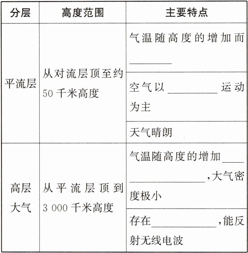 1. 物理性质 运动状况 2. 平流层 降低 对流 升高 水平 先降低后升高 电离层 [思考感悟] 平流层大气以水平运动为主,大气稳定,天气晴朗,利于航空飞行。