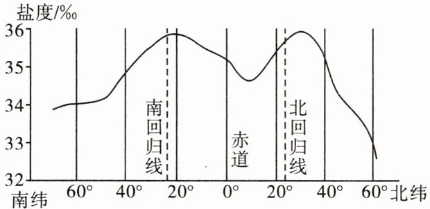 (2) 差异:北纬60°盐度低于南纬60°。原因:北纬60°附近陆地面积广阔,有大量河流注入,淡水稀释作用强;南纬60°附近以海洋为主,入海径流少。