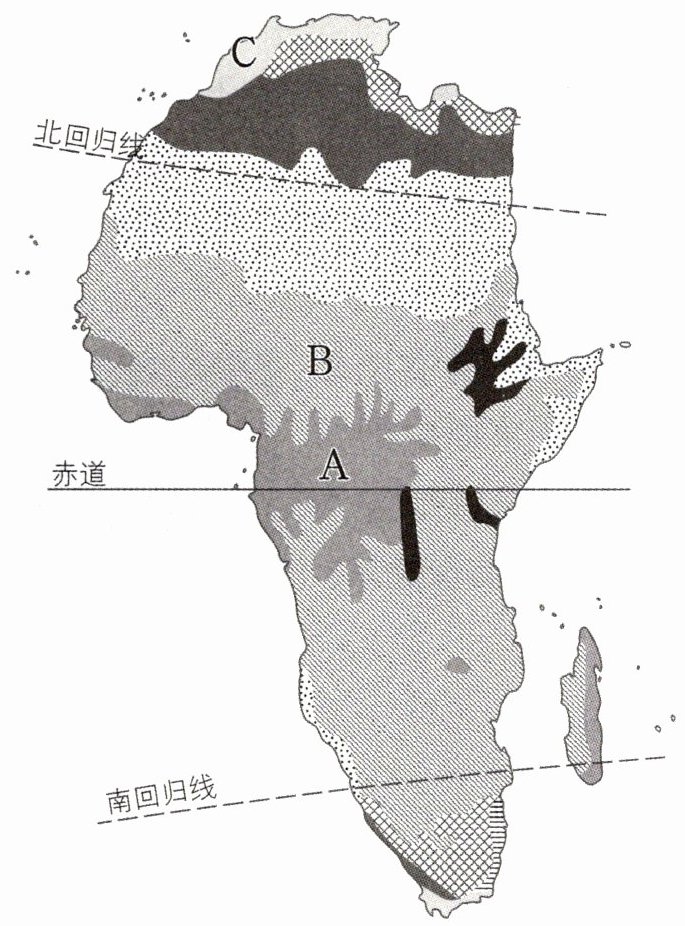 (1)A:热带雨林;B:热带稀树草原;C:常绿硬叶林。