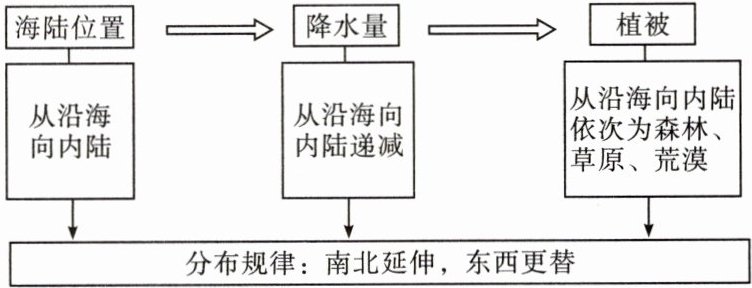 海陆位置从沿海向内陆变化,导致降水量从沿海向内陆递减。受水分条件影响,从沿海向内陆植被依次为森林、草原、荒漠,其分布规律为南北延伸,东西更替。