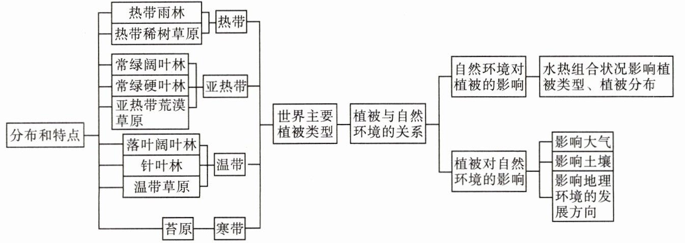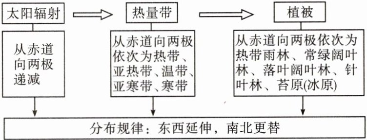 1. 热量对植被分布的影响:太阳辐射从赤道向两极递减,形成热带、亚热带、温带、亚寒带、寒带热量带,使植被从赤道向两极依次为热带雨林、常绿阔叶林、落叶阔叶林、针叶林、苔原(冰原),分布规律为东西延伸,南北更替。