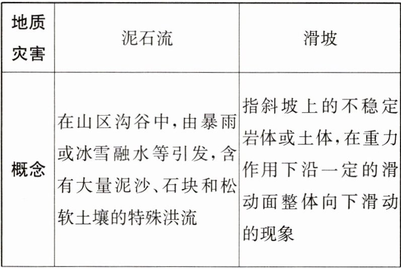 | 概念 | 在山区沟谷中,由暴雨或冰雪融水等引发,含有大量泥沙、石块和松软土壤的特殊洪流 | 指斜坡上的不稳定岩体或土体,在重力作用下沿一定的滑动面整体向下滑动的现象 |