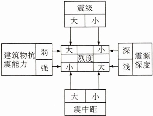 震级(大/小)→烈度(大/小)→震源深度(深/浅)→烈度(小/大)→震中距(大/小)→烈度(小/大)→建筑物抗震能力(弱/强)→烈度(大/小)