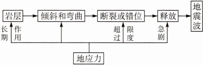 岩层→长期作用→倾斜和弯曲→地应力→超过限度→断裂或错位→急剧释放→地震波
