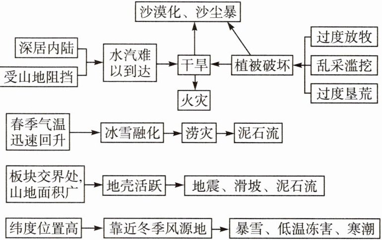 自然原因:深居内陆,水汽难以到达→干旱→沙漠化、沙尘暴;春季气温回升→冰雪融化→涝灾→泥石流;板块交界,山地广→地震、滑坡、泥石流;纬度高,近冬季风源地→暴雪、冻害、寒潮。