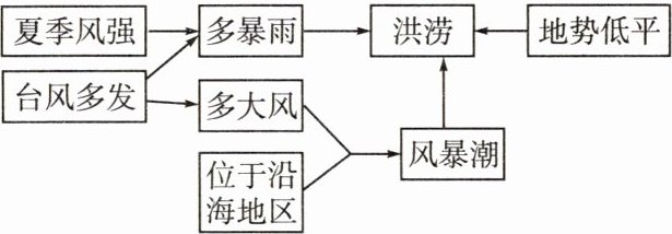 成因:夏季风强→暴雨→洪涝(地势低平);台风多发→大风、风暴潮(沿海)。