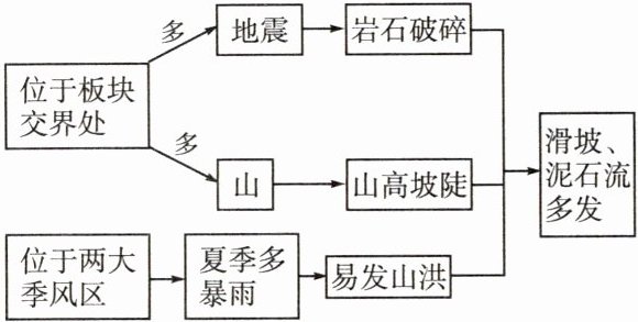 成因:板块交界处→地震→岩石破碎;山高坡陡,夏季暴雨→滑坡、泥石流。