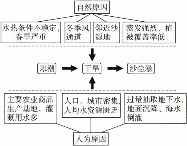 人为原因:农业灌溉用水多,人口城市密集,过量抽取地下水→加剧干旱。