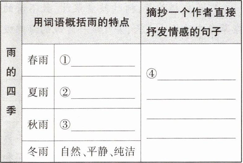 |雨的四季|用词语概括雨的特点|摘抄一个作者直接抒发情感的句子|