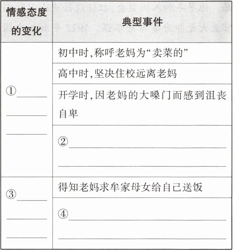 1.①嫌弃、讨厌 ②因老妈零利润为学校食堂送菜而感到崩溃 ③理解、敬重 ④第一次去菜店,帮老妈码菜 2.