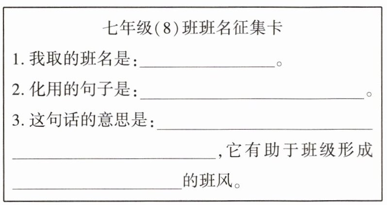 七、“集思广益”是与诸葛亮有关的一个成语。为创建班级文化,七年级(8)班准备化用诸葛亮《诫子书》中的句子取一个简练响亮的班名。班主任希望同学们集思广益,请你按要求完成下面的班名征集卡。