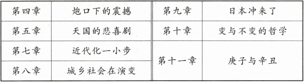 (1)第五章:太平天国运动(2分);第七章:洋务运动(2分);第九章:甲午中日战争(2分);第十章:戊戌变法(或百日维新)(2分)。
