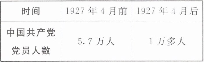(3)变化:中国共产党党员人数大量减少。原因:国共合作破裂,蒋介石发动四一二反革命政变;汪精卫召开会议,决定“分共”,大肆屠杀共产党人。