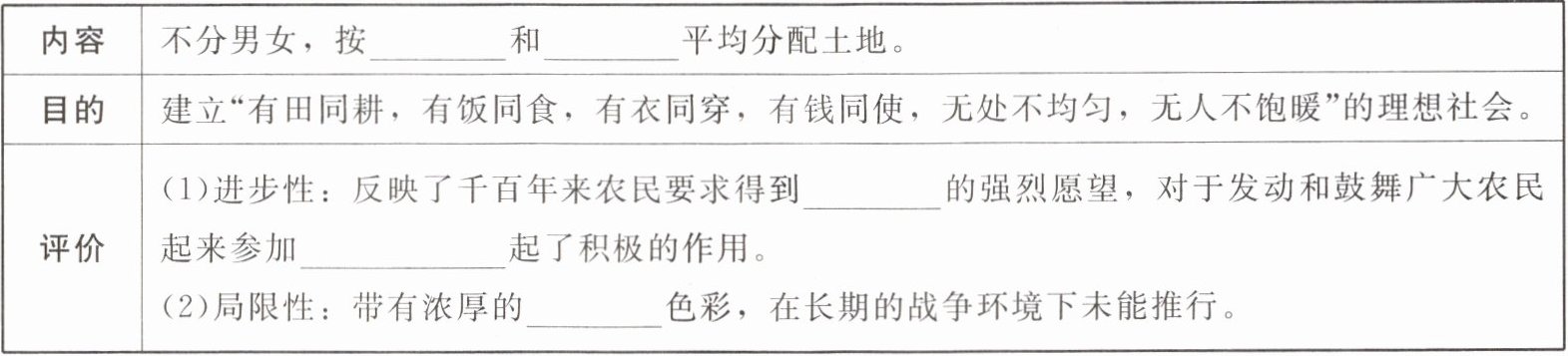 |评价|(1)进步性:反映了千百年来农民要求得到____的强烈愿望,对于发动和鼓舞广大农民起来参加____起了积极的作用。
