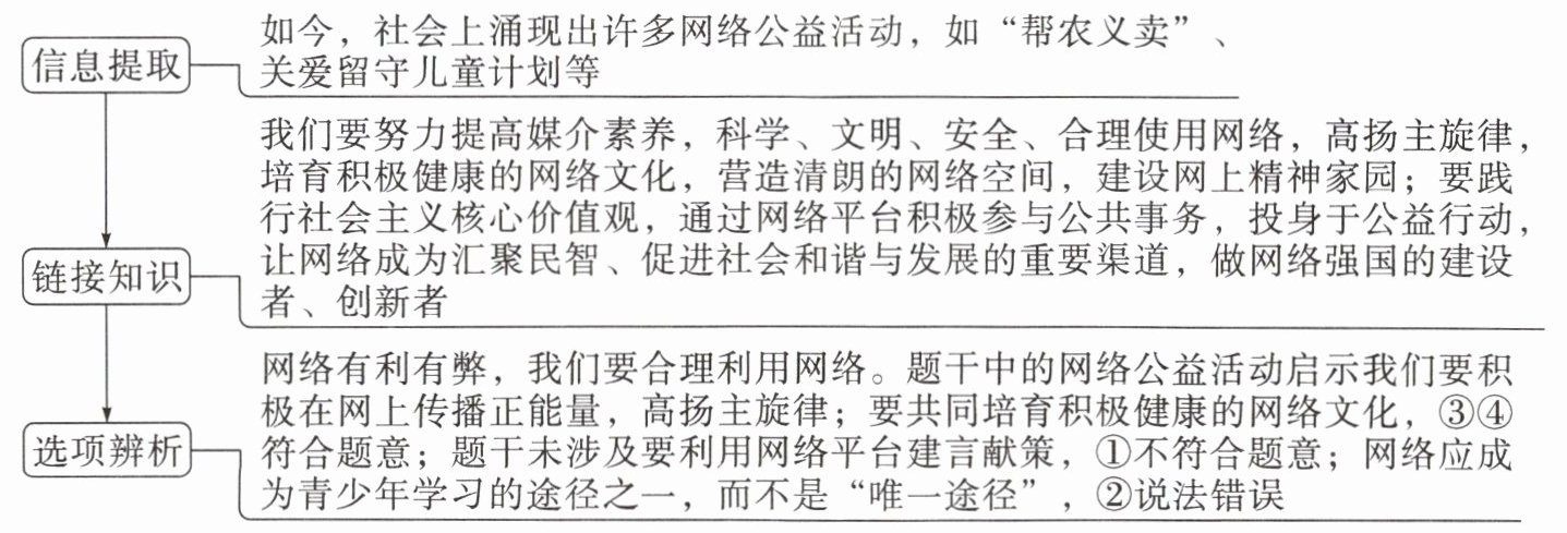 选项辨析:网络有利有弊,我们要合理利用网络。题干中的网络公益活动启示我们要积极在网上传播正能量,高扬主旋律;要共同培育积极健康的网络文化,③④符合题意;题干未涉及要利用网络平台建言献策,①不符合题意;网络成为青少年学习的途径之一,而不是“唯一途径”,②说法错误