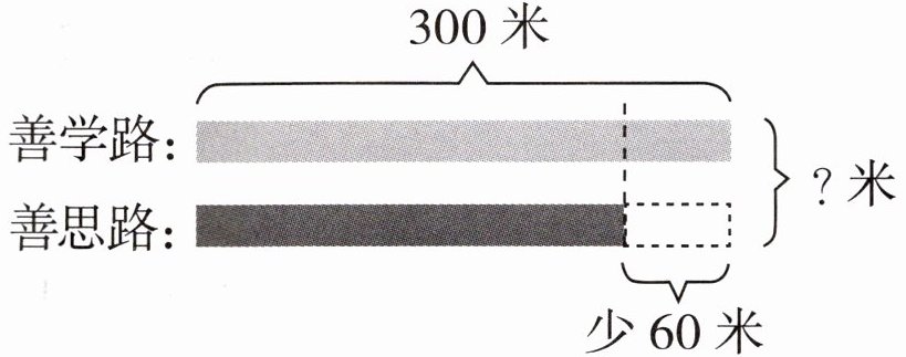 善学路的长度+善思路的长度=两条路的总长度 300-60+300=540(米)