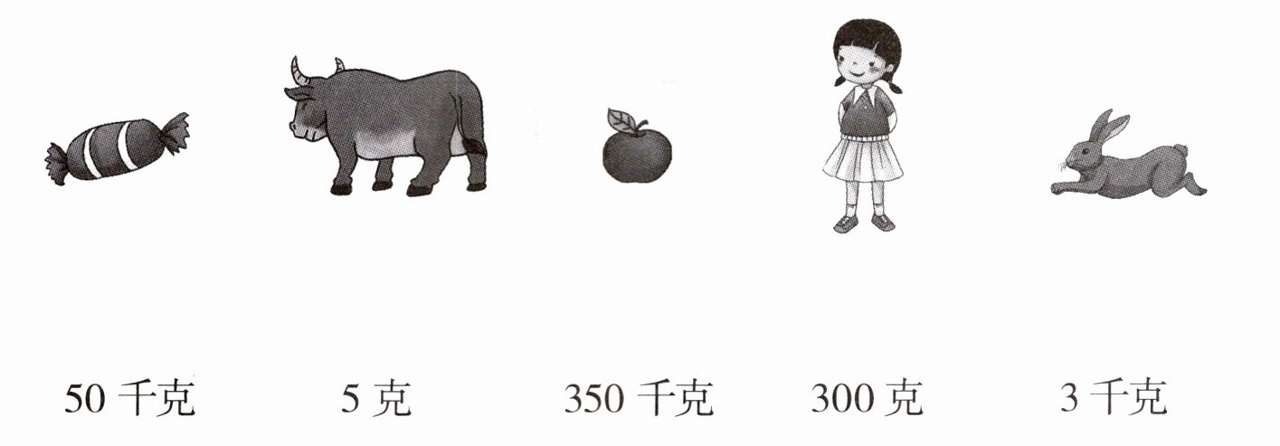 糖果连5克;牛连350千克;苹果连300克;小女孩连50千克;兔子连3千克。
