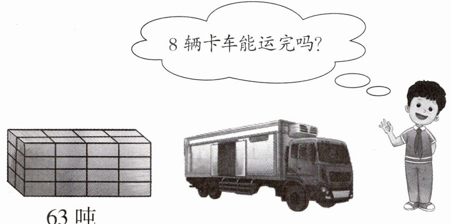 8×8=64(吨) 64吨>63吨 答:8辆卡车能运完。