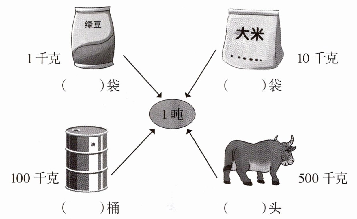 5. 在每幅图下面的括号里填上合适的数使它重1吨。