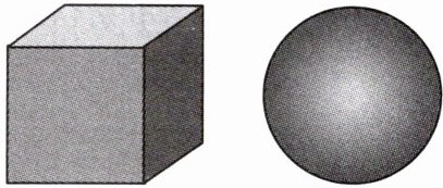 3. 观察正方体和球。想象一下:从它们的前面、侧面和上面观察,看到的分别是什么图形?写出名称。