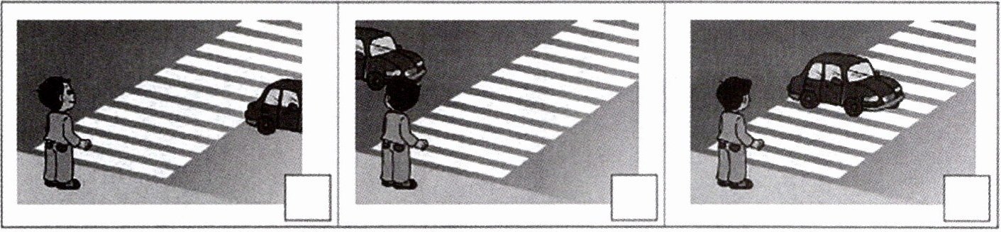5. 乐乐走人行横道准备过马路时,一辆小汽车从他的面前驶过。你能按时间顺序给下面的 3 幅图编号吗?