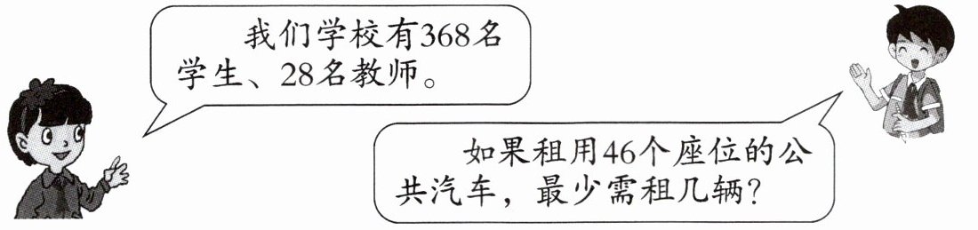 368+28=396(名) 396÷46=8(辆)…28(个) 8+1=9(辆) 答:要租9辆车。