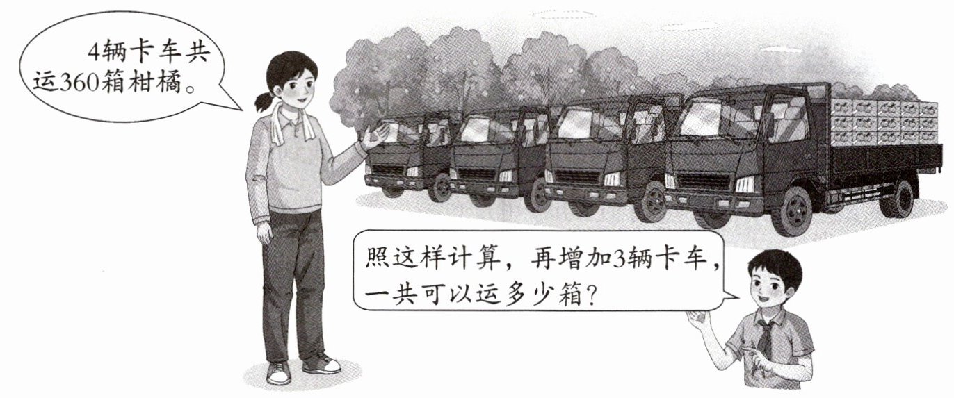 360÷4=90(箱) 3+4=7(辆) 90×7=630(箱) 答:一共可以运630箱。
