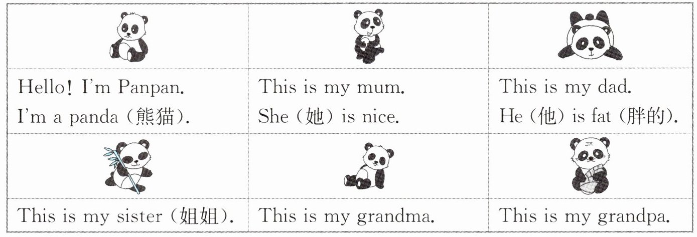 二、Look, read and finish. 下面是一本有趣的绘本,名为《熊猫盼盼的一家》,请大家仔细阅读,完成下列任务。