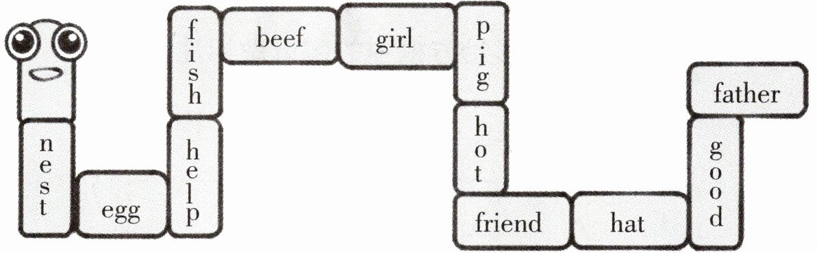 (注:按贪吃蛇身体顺序依次圈出每个单词中含有的e/f/g/h字母,每个单词圈一个对应字母,上述为各单词中需圈出的字母。)