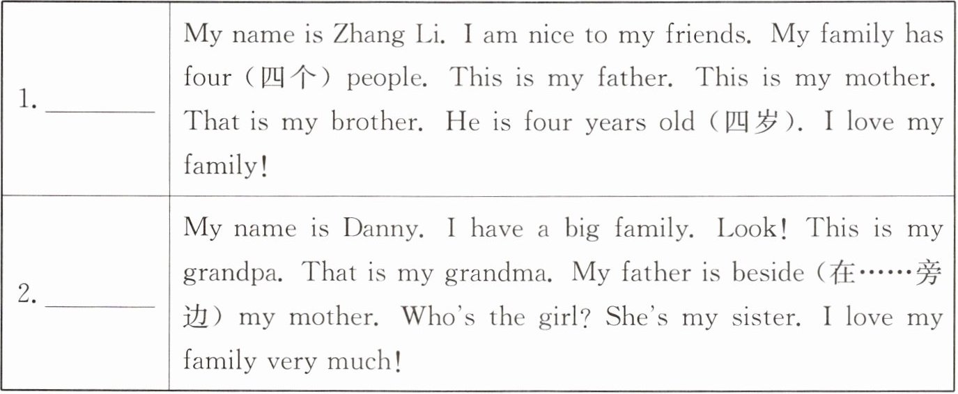 | 1. ______ | My name is Zhang Li. I am nice to my friends. My family has four (四个) people. This is my father. This is my mother. That is my brother. He is four years old (四岁). I love my family! |