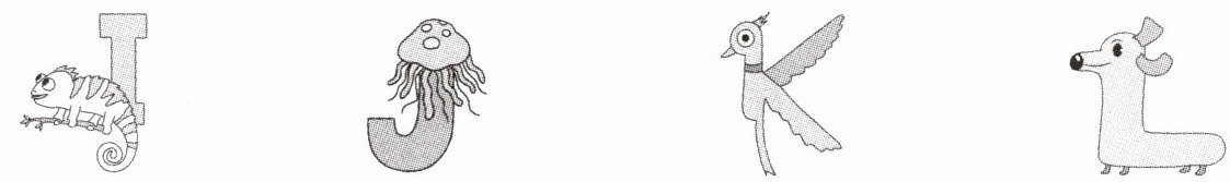 笔顺: 先写竖左拐,再在上方加点(大写J下端要向左绕半圆;小写j的圆部分在下格,竖在中格,点在上格)。