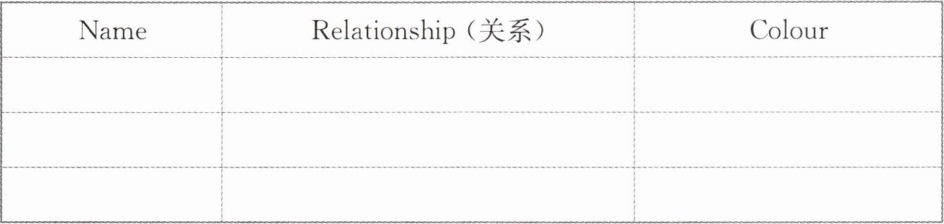 | Name | Relationship(关系) | Colour |