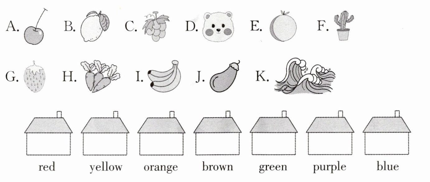 一、Look and classify. 你知道下列事物通常是什么颜色吗?请将它们放在对应颜色的屋子里。