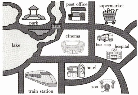 三、Look, read and judge. Lily 和爸爸妈妈一起去了 Happy Town 旅游,下面是她从酒店前台拿到的地图。观察地图,判断下列句子与地图是(T)否(F)相符。