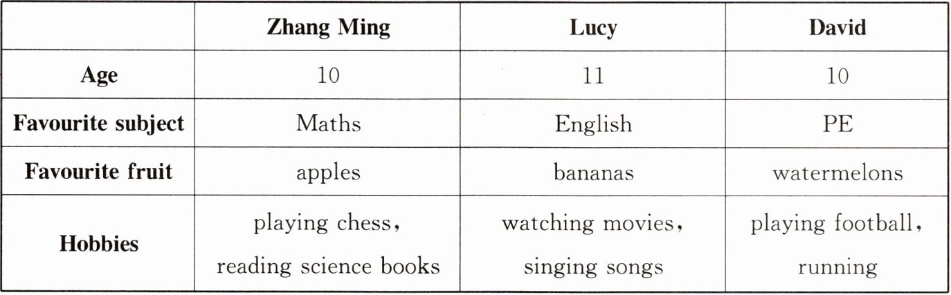 六、Read and choose. 在班级举办的“友谊风采秀”活动中,Andy 向同学们介绍他的三位朋友。阅读他们的信息,选择正确的答案。