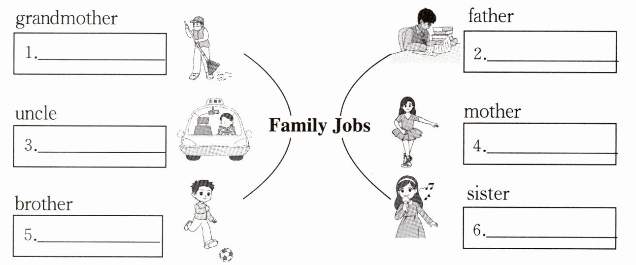 一、Look, read and fill. 根据图片提示,了解 Lisa 家人的职业,并完成思维导图。