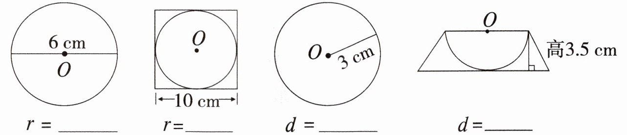 2. 用圆规画出下面的圆,并用字母 $ O $、$ r $、$ d $ 分别表示出圆心、半径和直径。