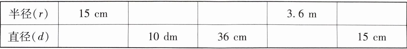 3. 半径(r) 15cm 5dm 18cm 3.6m 7.5cm 直径(d) 30cm 10dm 36cm 7.2m 15cm