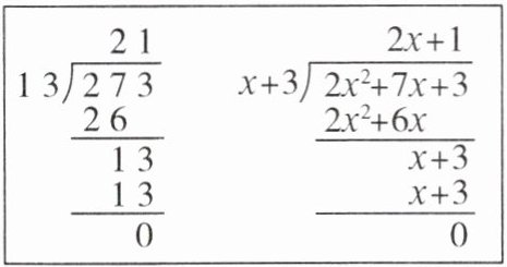 7. 在学习了单(多)项式除以单项式后,数学小组的成员讨论起该如何解决多项式除以多项式的问题,通过自主学习他们发现可以仿照整数的除法利用竖式进行计算。如 $(2x^{2}+7x+3)÷(x + 3)$ 可以仿照 $273÷13$ 进行计算(如下图):