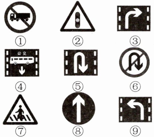 6 下面的交通标志牌你都认识吗?分一分,将序号填入相应的横线上。