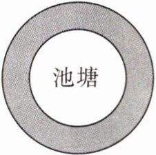 19. 下图池塘的周长是 94.2 m,池塘周围(阴影部分)是一条 5 m 宽的水泥路,路的外侧围了一圈栏杆。水泥路的面积是多少平方米?栏杆长多少米?($\pi$ 取 3.14)