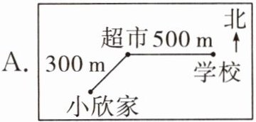 1. 小欣说:“我每天从家出发向东北方向走 $300$ m 到超市,再向正东方向走 $500$ m 到学校。”根据小欣的描述,画出她从家到学校的路线图。下面四幅图中,正确的是 ( )
