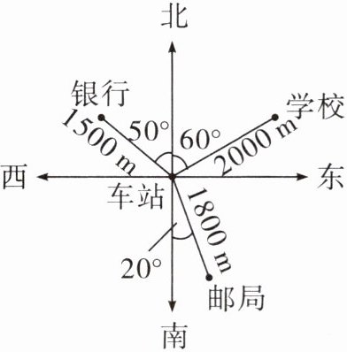 (3) 银行在车站____偏____ ____方向上,距离是____m。